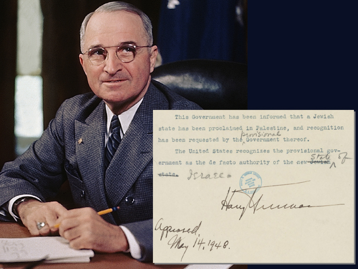 “I had faith in Israel before it was established, I have in it now. I believe it has a glorious future before it -not just another sovereign nation, but as an embodiment of the great ideals of our civilization.” — U.S. President Harry S. Truman |