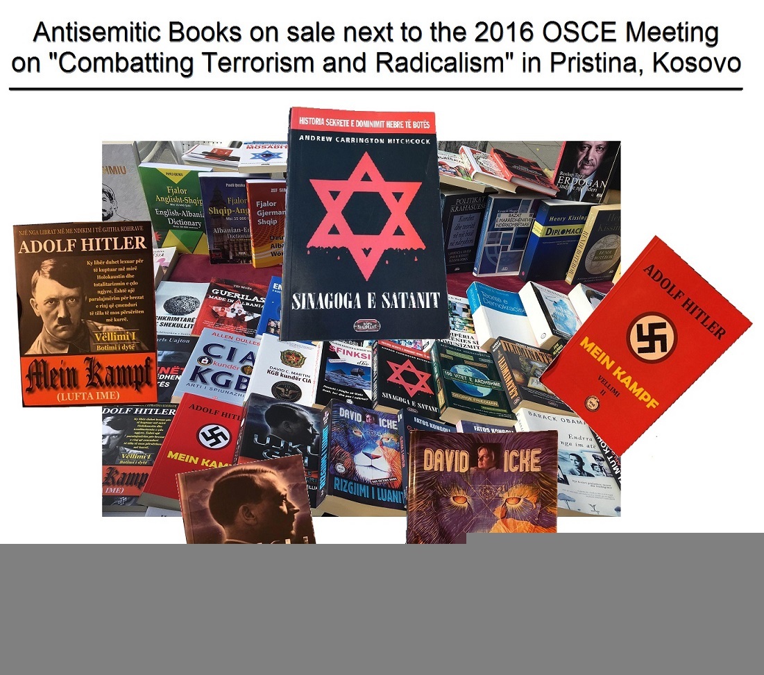Samuels recalled how, "in 2016, following our protest, the 57 member-state Organisation for Cooperation and Security in Europe (OSCE)closed down a bookstore at its meeting in Pristina, Kosovo, which displayed several versions in Albanian, of Hitler’s Mein Kampf, together with Icke’s Human Race Get OffYour Knees: The Lion Sleeps No More, wherein the 'Universal Controllers' are portrayed as a a reptilian race from outer space."